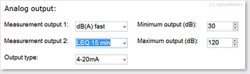 In the example above, the first output is the average sound level every second (probably the most useful parameter available) while the second output is the average over a 15 minute period. A sound level of 50dB will be the minimum (4mA) and a sound level of 90dB will be the maximum (20mA).